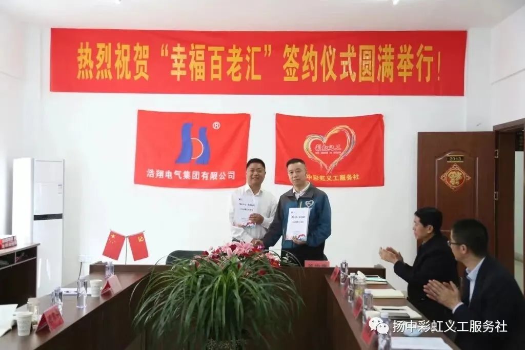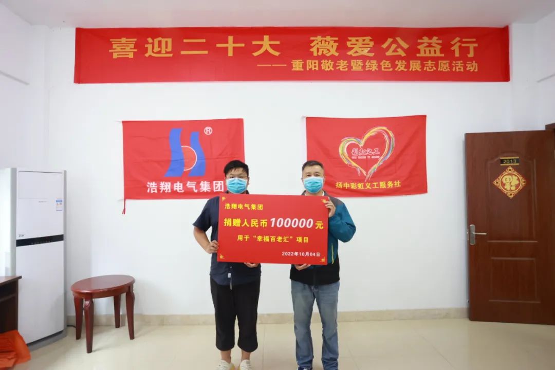 2020年,扬中彩虹与浩翔电气签订了“幸福百老汇”项目合作协议,承诺每年捐10万元,10年100万元,为我市孤寡空巢老人捐物资献爱心,在物质、健康和精神上给老人们提供帮助。